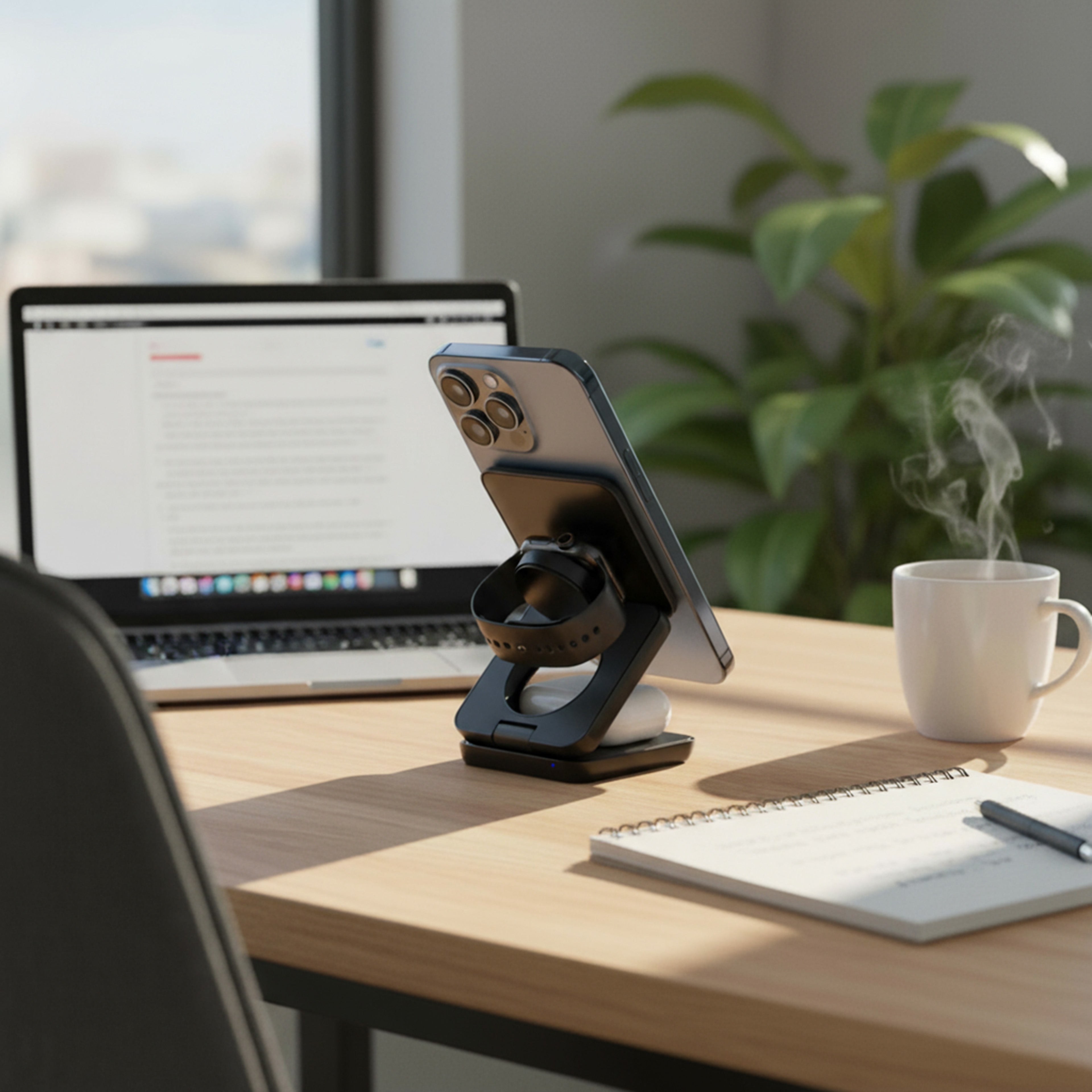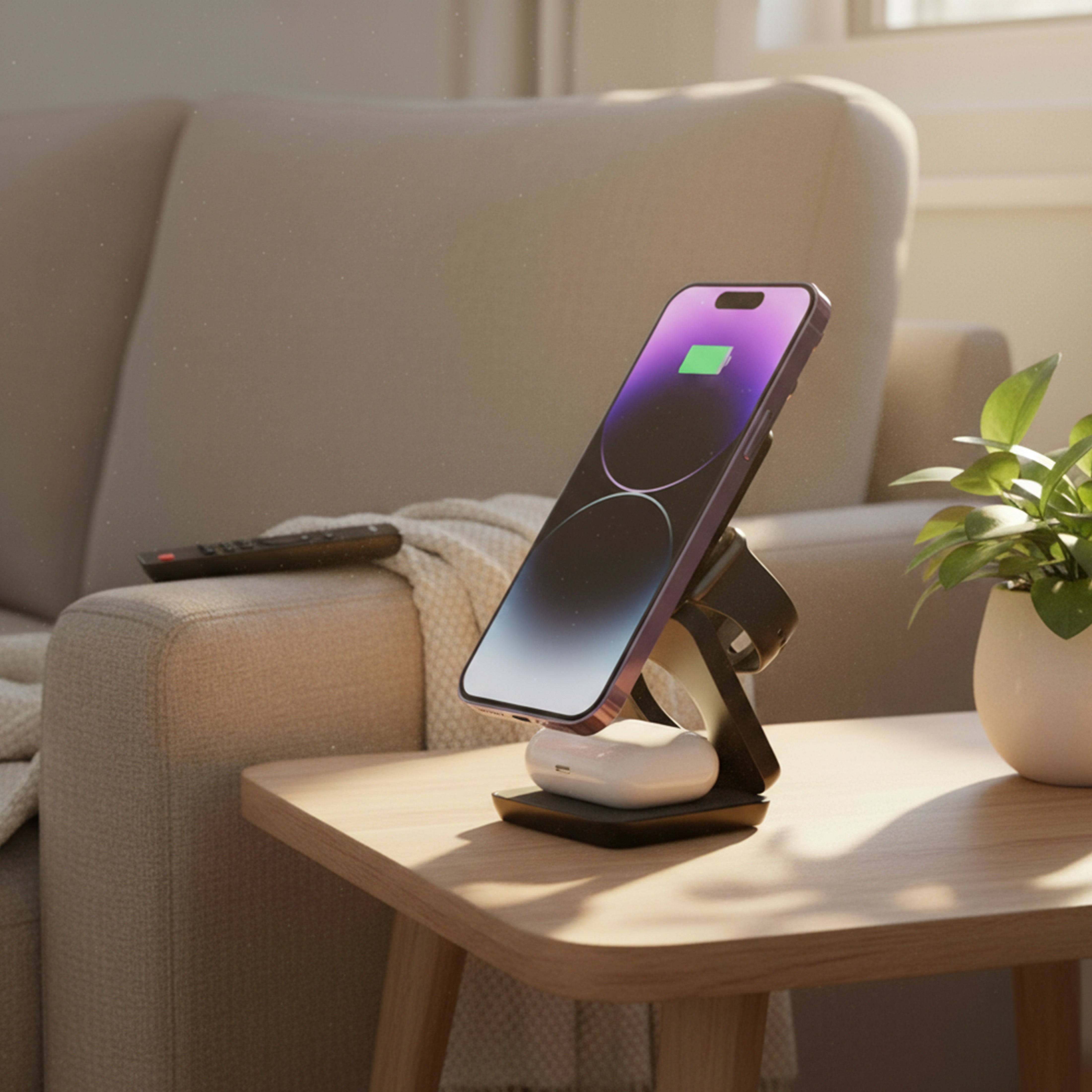 This charging station cuts through the chaos with one sleek, wireless setup. Just place your devices and power up. One sleek station, one cord, no mess. Your space looks better and your day runs smoother.