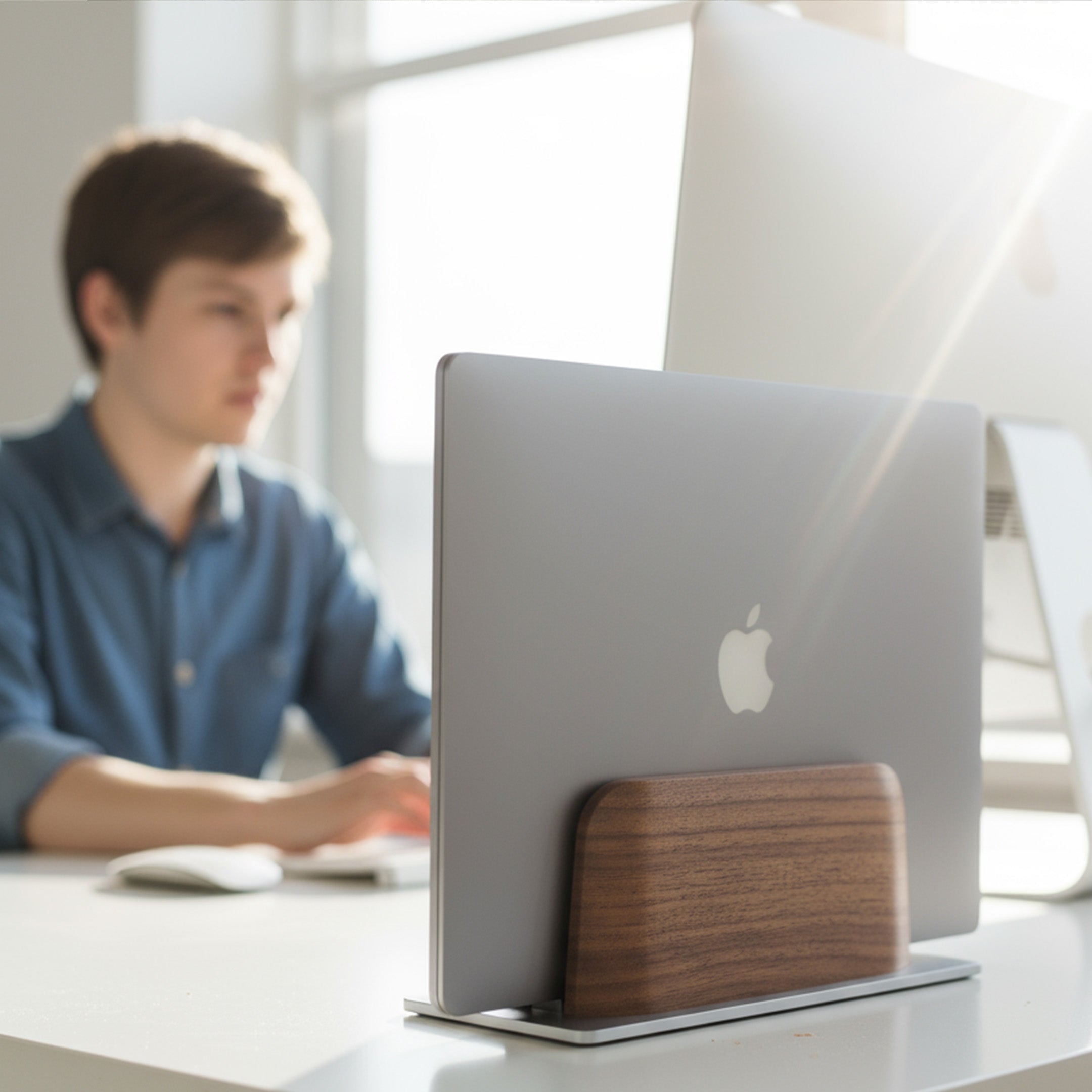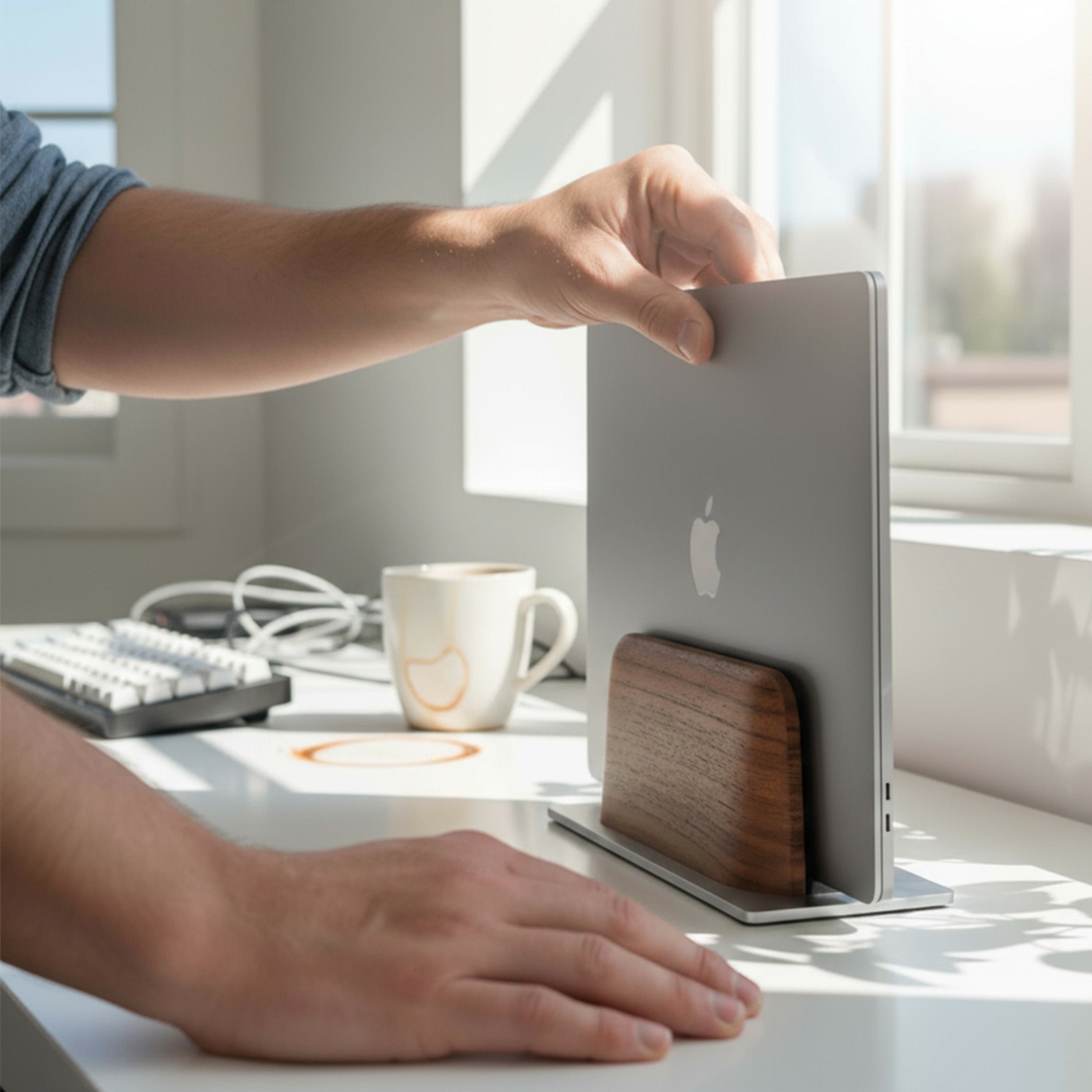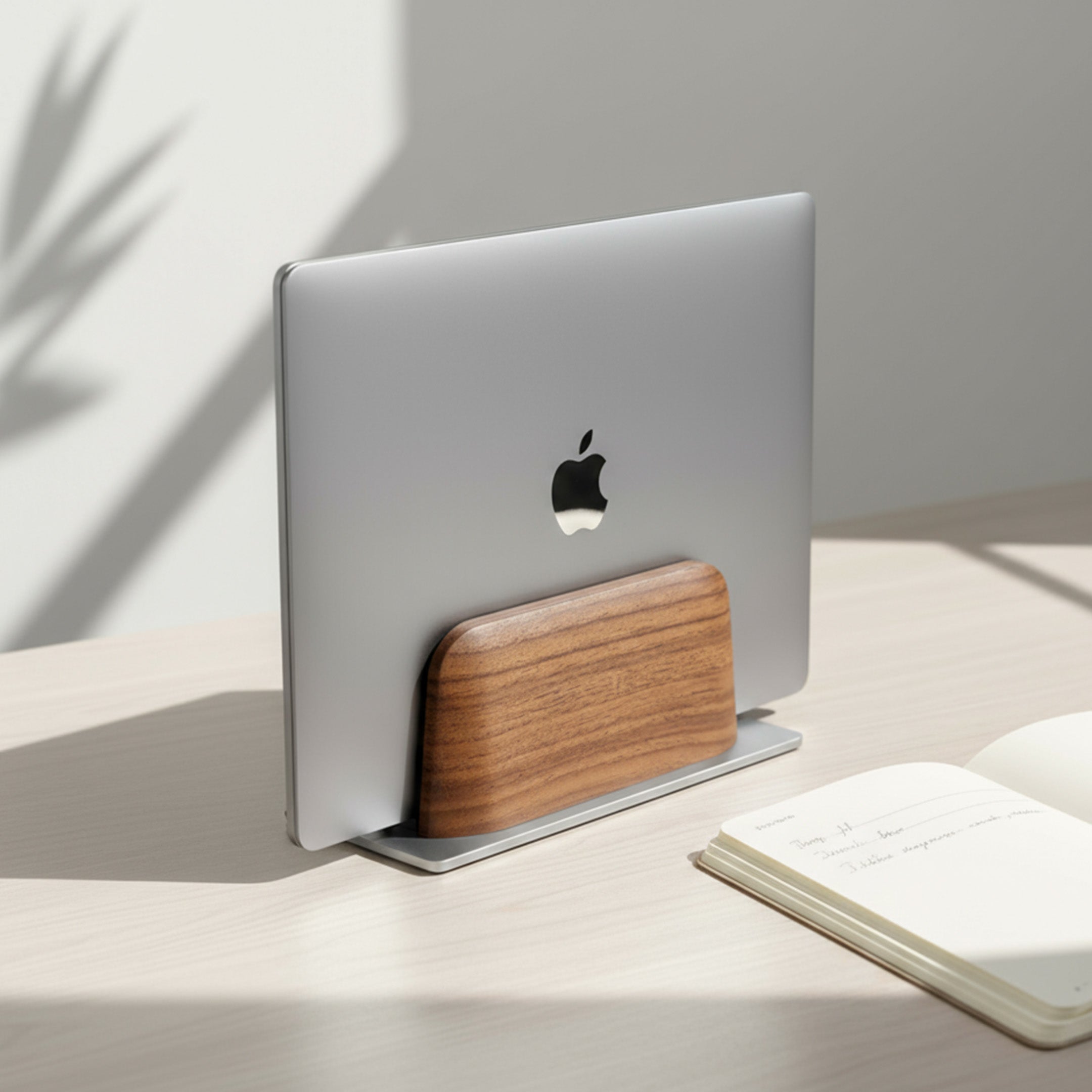 Its upright form keeps your laptop securely stored while freeing up valuable desk space. By positioning your device vertically, it reduces clutter, opens up your workspace, and makes every surface look intentional and organized — turning a crowded desk into a minimalist setup that breathes focus.